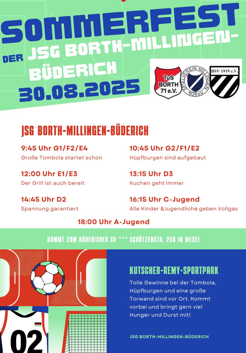 Die Saisoneröffnung der JSG Borth/Millingen/Büderich mit einem großen Sommerfest und vielen Attraktionen findet in diesem Jahr auf der Sportanlage des SV Büderich statt.